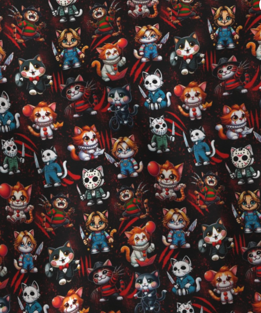Side 1: Cats in various costumes of horror film serial killers against a black background. Side 2: Blue and Yellow